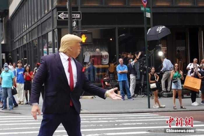 資料圖:當(dāng)?shù)貢r(shí)間8月10日,一名戴著面具的示威者在美國(guó)紐約特朗普大廈外模仿美國(guó)前總統(tǒng)特朗普。近兩日,特朗普大廈前示威者、記者、圍觀民眾等人流聚集。 中新社記者 廖攀 攝